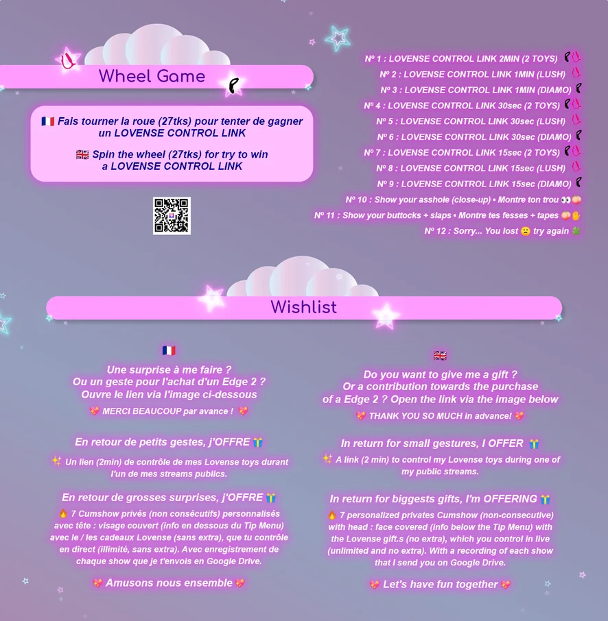 🇫🇷 Pas de demandes de PM ou d'amis. Trop de demande et surtout trop compliqué à modérer. J'accèpte les demandes d'amis uniquement de ceux qui tips suffisament durant mes streams. Merci. 🇺🇸 No PM. Too many requests and too complicated to moderate. I only accept friend requests from those who tips sufficiently during my streams. Thank you.